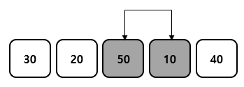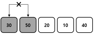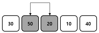 ① 먼저 첫 번째 원소와 두 번째 원소를 비교한 후 큰 값을 뒤에 위치로 옮겨준다. 30과 50을 비교하였을 때 50이 더 크기 때문에 위치를 변경하지 않는다. 그 이후 두 번째 원소와 세 번째 원소를 비교한다. 50과 20을 비교하였을 때 두 번째 원소가 더 크기 때문에 세 번째 원소와 서로 위치를 변경한다.